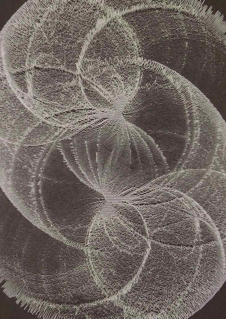 Highly detailed linear 'Double Moons' abstract composition. Hand produced with gold metal pigment inks and traditional acrylics on a deep brown flood. These prints look stunning under direct lighting conditions.
