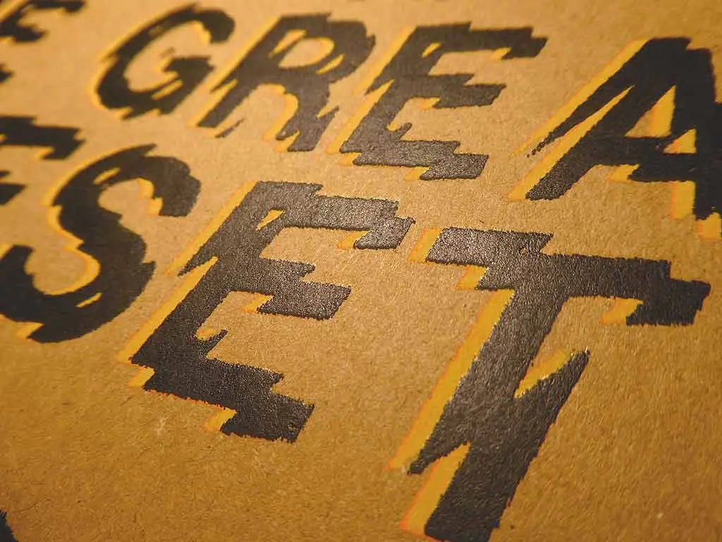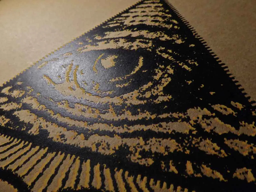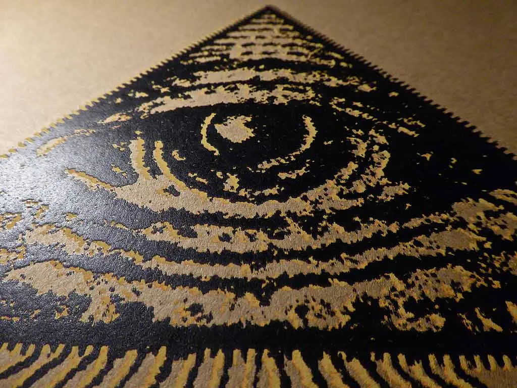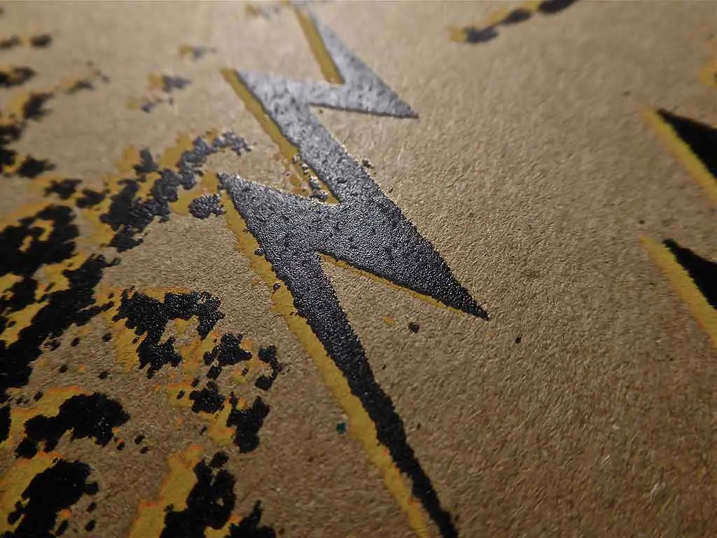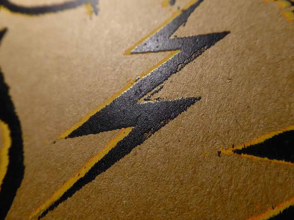 The black foreground image was run through the press a number of times which gradually increased the ink definition. A semi-gloss varnish was then overprinted on all the black components. You can see in the close up shots the three dimension textural definition that was achieved.